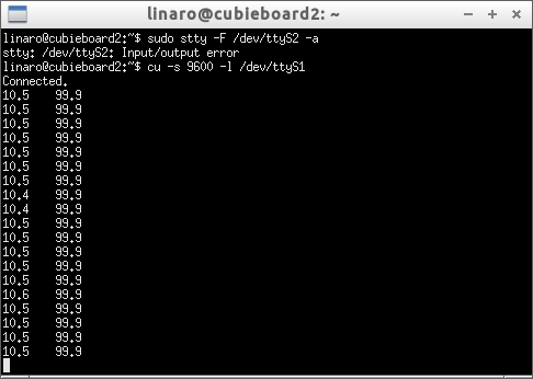 To test my changes I used utility called “cu” that I have installed and started on ttyS1 with 9600 baud rate.