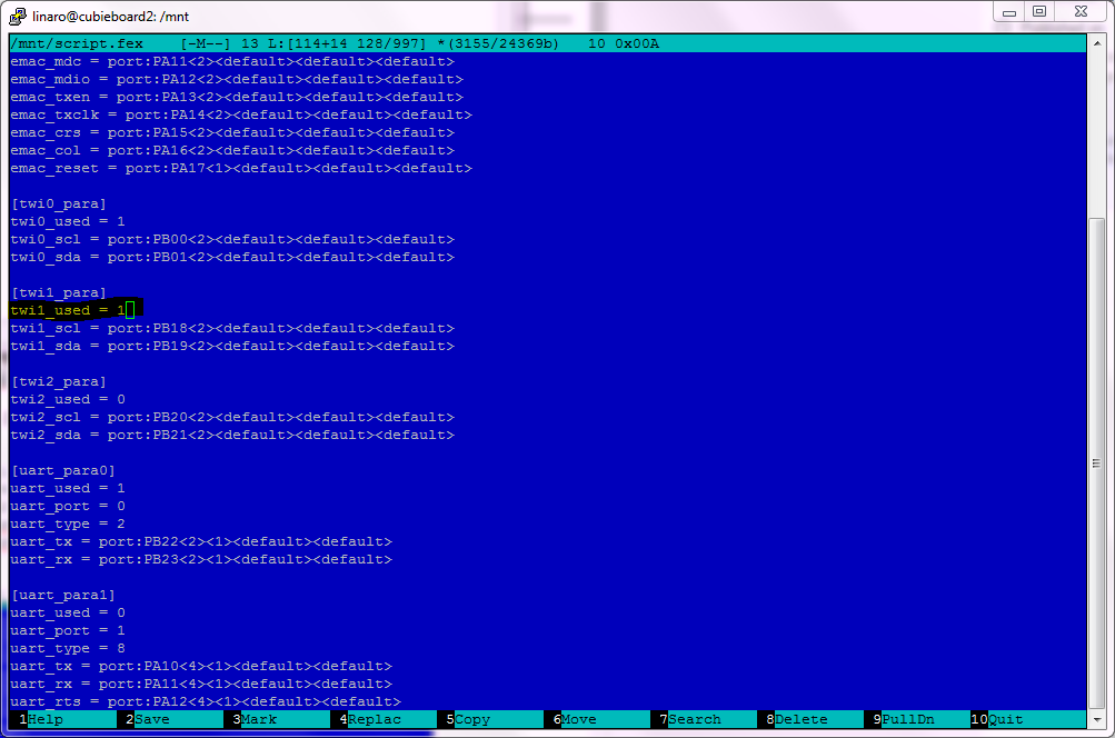 I changed only i2c (twi)- I selected the one that was already configured to PB18/19 twi1_para. Pin #6 is SCL and pin #7 is SDA (U15 – the pin array near the USB-Ports). Refer to pin definition (or this PDF) :