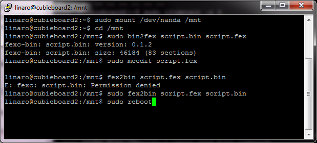 sudo mount /dev/nanda /mnt cd /mnt sudo bin2fex script.bin script.fex sudo vi script.fex