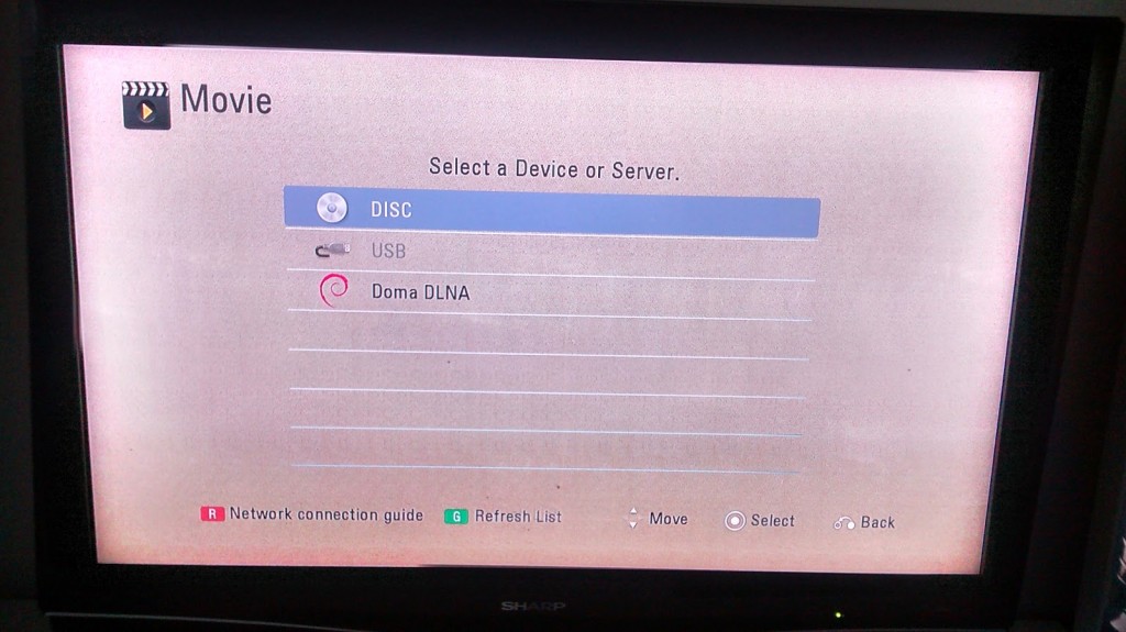 Now I will try my LG home theater that is DLNA client certified and I’m able to select my new media server as I’ve configured – Doma DLNA. Minidlna in Ubuntu uses Debian logo: