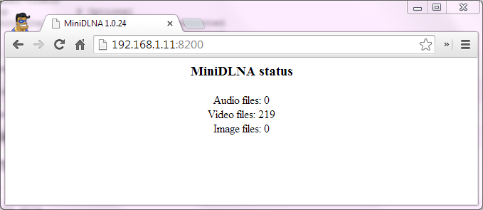 Since we also opened http connection, you can check the status of minidlna scanned files by going to its IP address and port 8200: