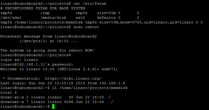 sudo mcedit /etc/fstab tmpfs /home/linaro/projects/memdisk tmpfs size=10M,mode=0755,uid=linaro,gid=linaro 0 0