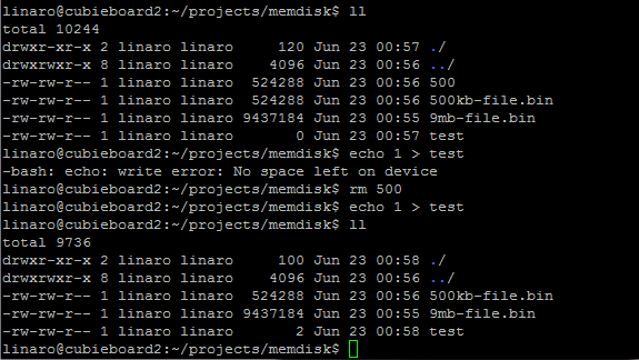 I hope I will prolong the lifetime of my NAND memory on Cubieboard2 by adding this filesystem in RAM. To test the total capacity of the folder I have created a 10MB file (0.5+0.5+9MB) and then tried to add a file with 1 byte. It worked – no space left on device as you can see on the screen capture below.