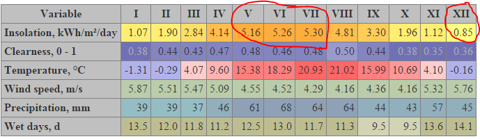In my location there is 5 hours daily of full sun in summer but only 1 during winter! Figures in chart of kWh/m^2/day is effectively “hours of full sun per average day” by month. Energy received at sea level is about 1kW/m2 at noon near the equator [source]. Use these when calculating panel energy available. It is also called solar irradiation and expressed as “hourly irradiation” if recorded during an hour or “daily irradiation” if recorded during a day (Wh/m2).