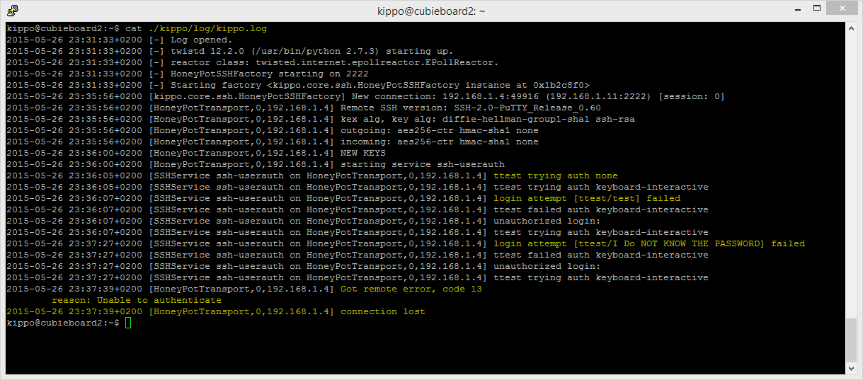 Kippo is an SSH honeypot written in Python. Kippo is used to log brute force attacks and the entire shell interaction performed by an attacker so I have installed it on my cubieboard2 Lubuntu version. According to wiki a honeypot is a trap set to detect, deflect, or, in some manner, counteract attempts at unauthorized use of information systems.