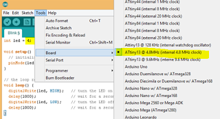 Start the Arduino IDE and there should be new options of ATtiny13 available under the Tools->board menu.
