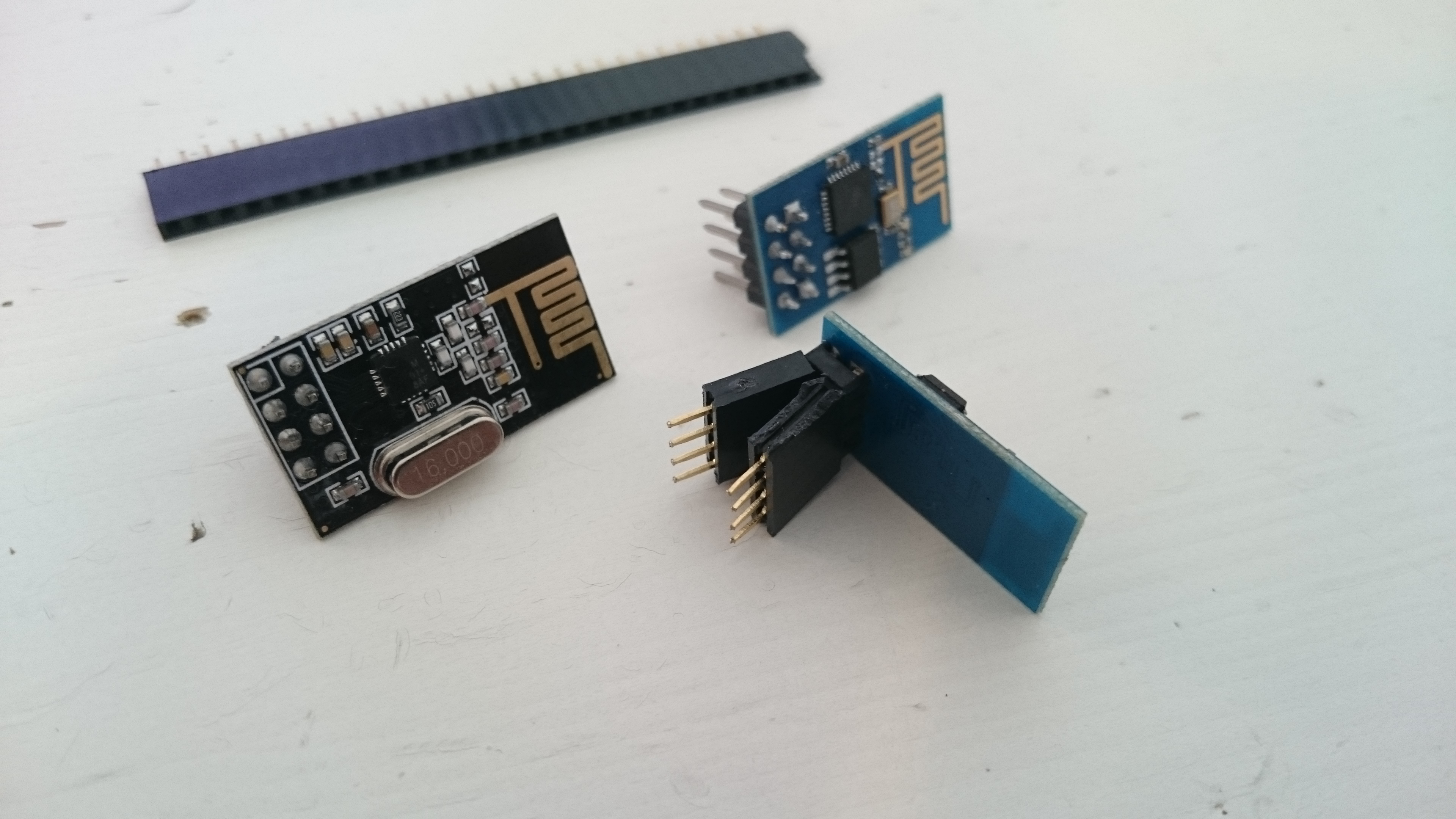To make it really simple just cut 2 times 4 pins from female header strip and plug them to ESP-01 or NRD24L01 – you are done. 😉