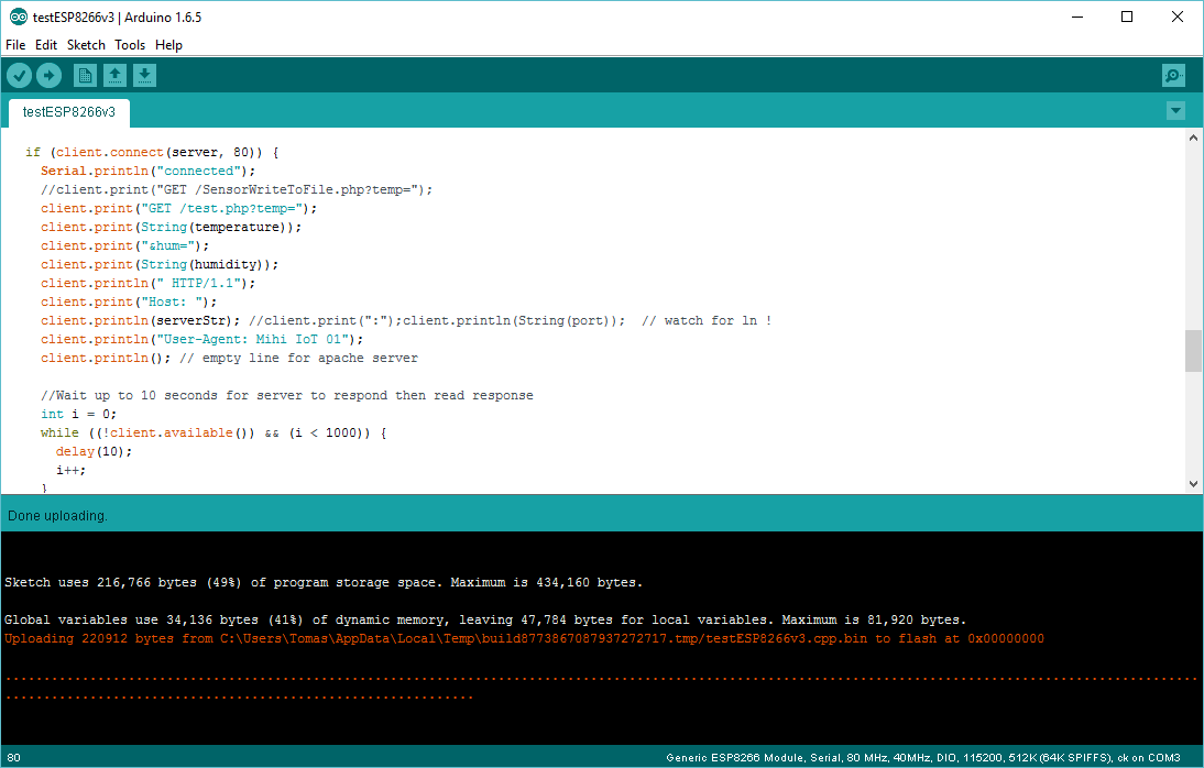 When it works, you should see the tiny blue light on the ESP-01 module flashing and the following display on the Arduino IDE.