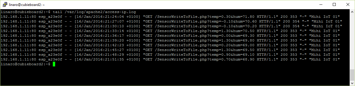 <?php // URI: /SensorWriteToFile.php?temp=23.50&hum=48.20 date_default_timezone_set('Europe/Bratislava'); $dateTime = new DateTime(); $dateTimeStamp = $dateTime->format('Y-m-d H:i:s'); $data = $_REQUEST; $data += array("datetime" => $dateTimeStamp ); $data += array("user_agent" => $_SERVER['HTTP_USER_AGENT'] ); $req_dump = json_encode( $data ) . "\n"; $fp = file_put_contents( '/var/www/request.log', $req_dump, FILE_APPEND ); // make /var/www/request.log file writable !! ?>
