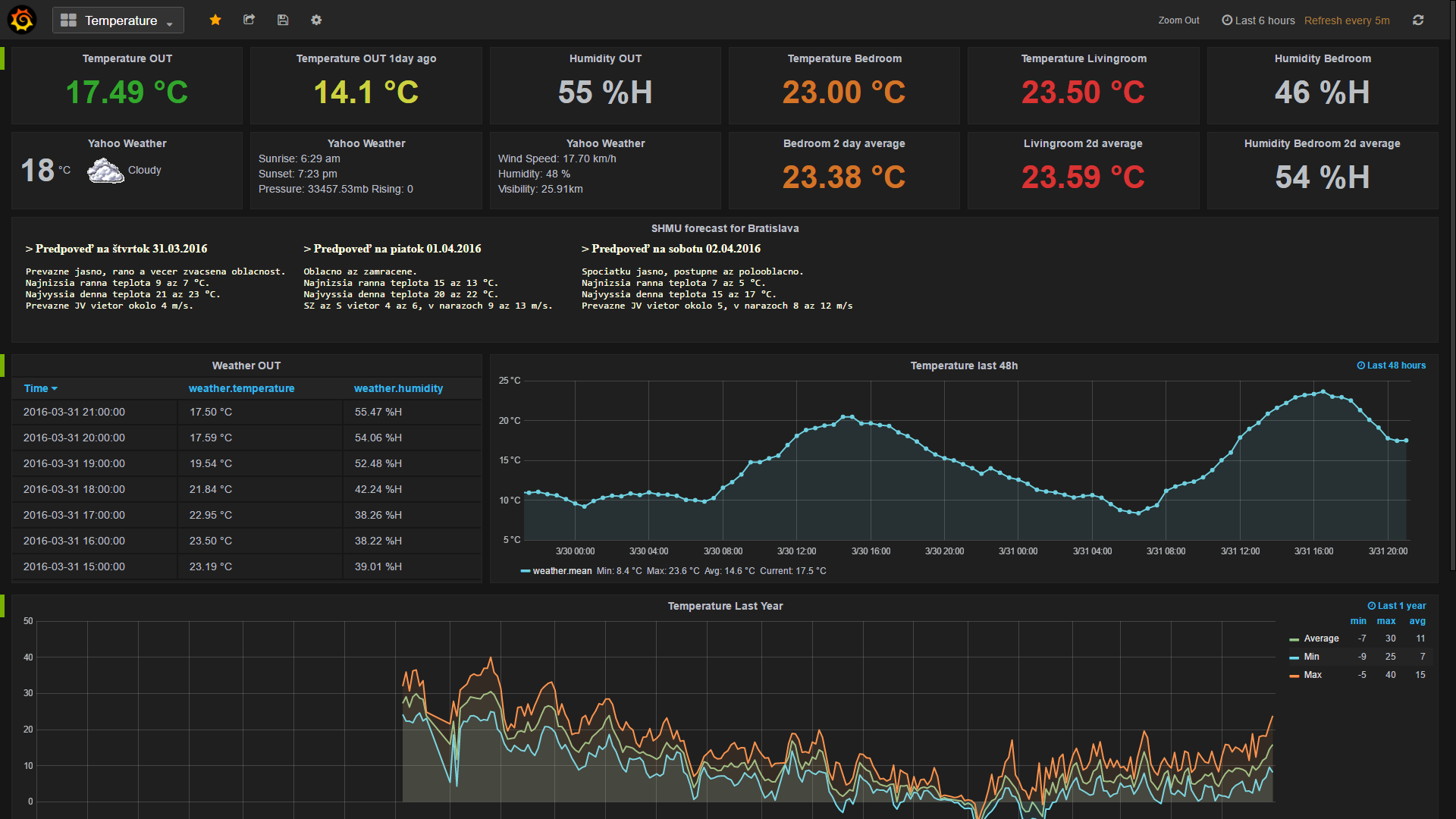 openHAB is an open source home automation system that’s both hardware-agnostic and protocol-agnostic. I have installed it and changed demo to my temperature sensor and also used yahoo wather data.